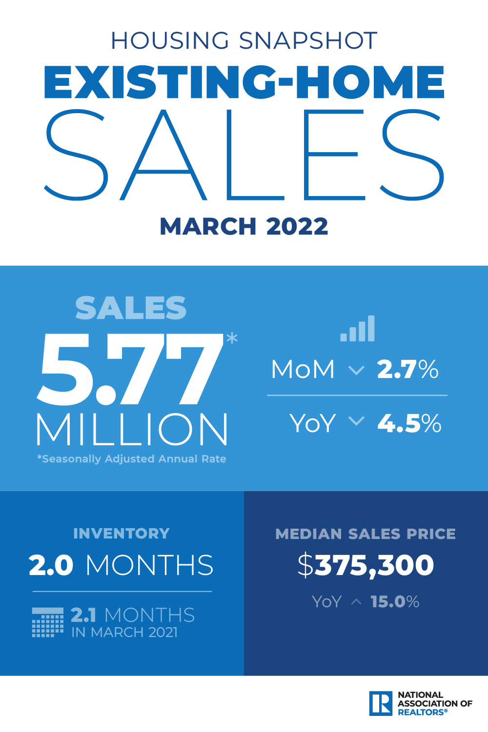 Total existing-home sales, which are completed transactions, including single-family homes, townhomes, condominiums and co-ops, slid 2.7% from February to a seasonally adjusted annual rate of 5.77 million in March. Year over year, sales were down 4.5% from 6.04 million transactions in March 2021.