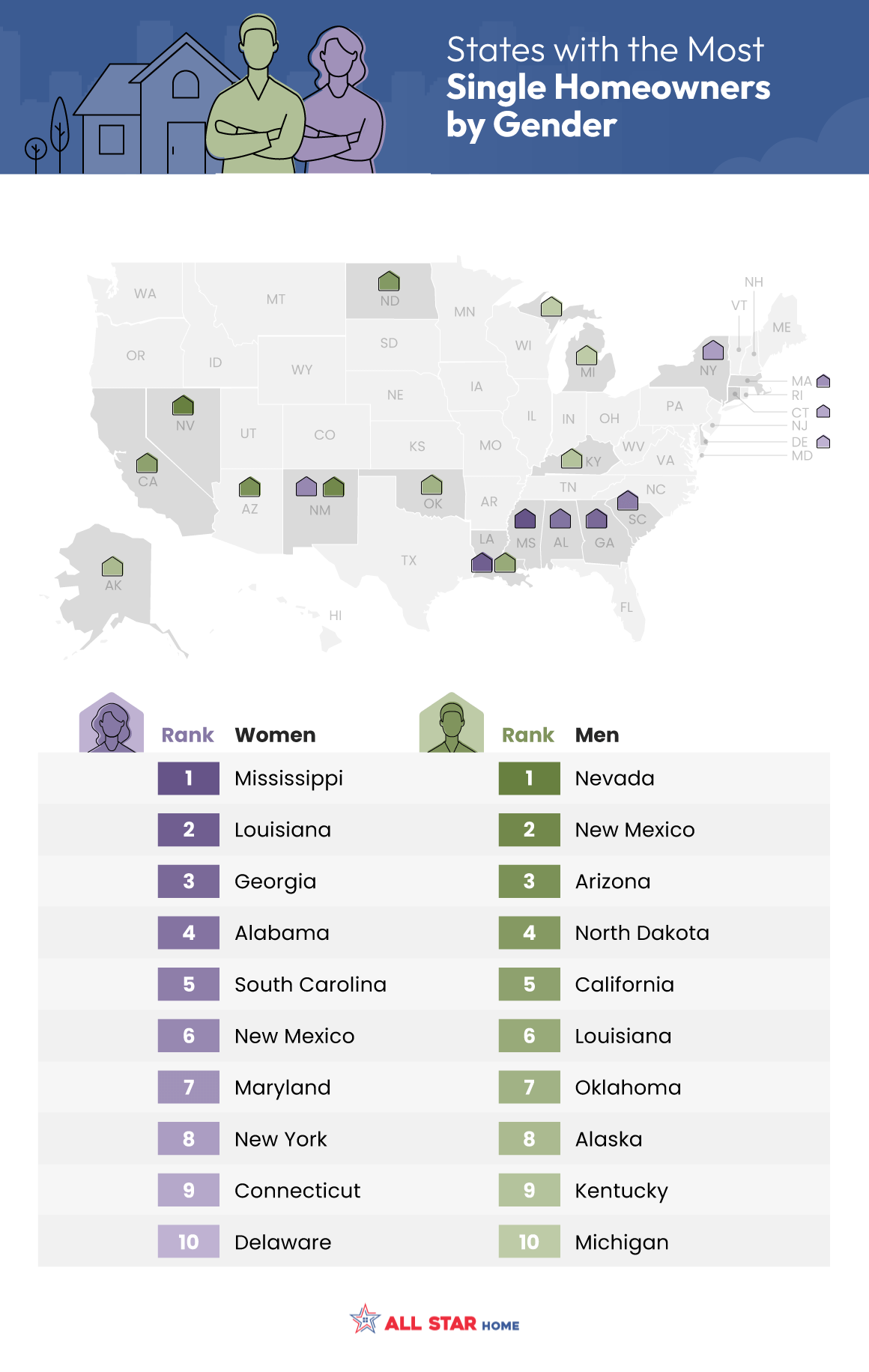 Breaking down the rankings by gender, Mississippi, Louisiana, Georgia, Alabama and South Carolina are the top five states for single women homeowners, coinciding with the data for single homeowners, generally.