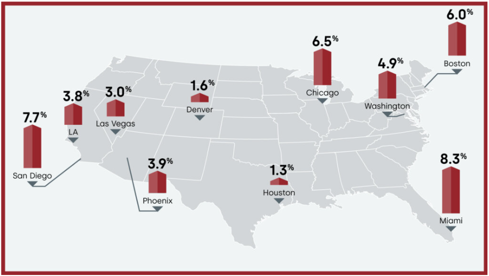 On a city basis, Miami once again posted the highest annual increase among the country’s 20 largest metro areas, at 8.3%, followed by San Diego at 7.7%, Chicago at 6.5% and Boston at 6%.