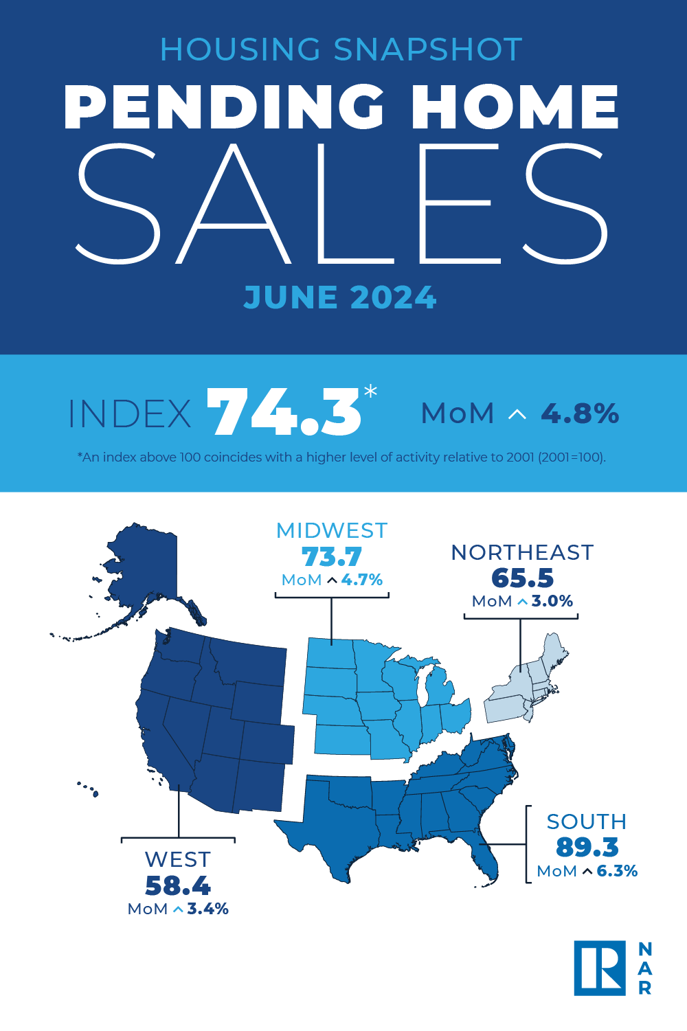 After two months of declines, pending home sales swung to positive territory in June, rising 4.8% from May as housing inventory increased and mortgage rates declined, the National Association of REALTORS® (NAR) said, citing its Pending Home Sales Index.