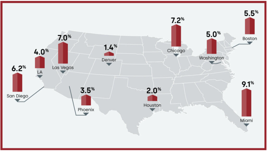 On a city basis, Miami once again posted the highest annual increase among the country’s 20 largest metro areas, at 9.1%, followed by Chicago at 7.2% and Las Vegas at 7%.