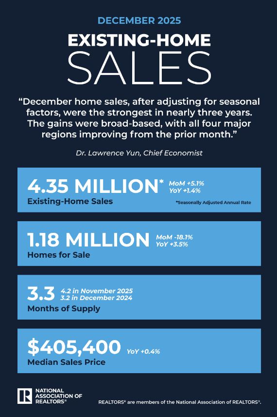 Existing-home sales in the U.S. jumped 5.1% month-over-month to a seasonally adjusted annual rate of 4.35 million in December, surpassing the consensus expectation of 4.23 million and representing the highest rate in almost three years, the National Association of REALTORS® said. Year over year, sales rose 1.4%.